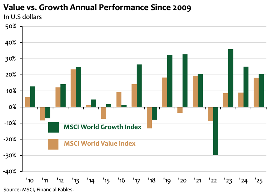 In equity markets, two rival styles are often cast as fighters in opposite corners of the ring: value investing and growth investing. Value investing focuses on companies whose shares appear cheap relative to fundamentals. Growth investing, by contrast, targets companies expected to expand rapidly, even if their current valuations look expensive. In theory, this should set up a fairly even contest. Each style ought to enjoy periods where it dominates the bout, followed by rounds where it takes a few hits and falls behind.