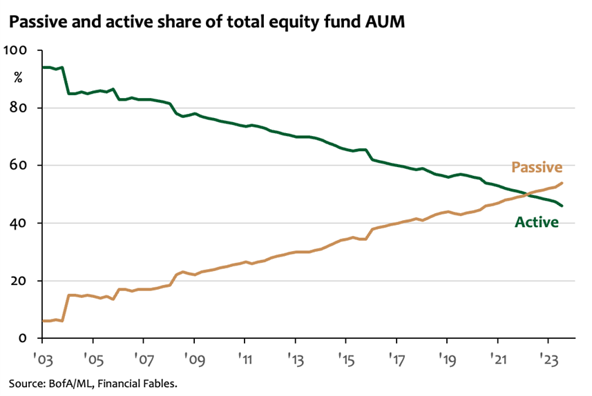 This creates a structural headwind for value stocks. Many traditional “deep value” names barely feature in the big indices, so passive flows simply bypass them. Markets don’t stop to reassess whether these companies are mispriced; they’re too small to move the benchmark and therefore too small to matter for passive allocators. Growth stocks, meanwhile, benefit from a self-reinforcing loop: higher weights attract more inflows, which push valuations higher, which then justify even larger weights. As you can see in the chart below, passive flows have just crossed 50% of total equity flows, suggesting this dynamic is only getting stronger. This is a market structure that simply didn’t exist in anything like its current form for most of the 20th century - which makes historical comparisons much less comforting for value investors today.