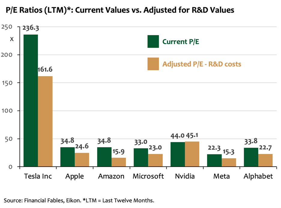 Once you adjust for this distortion, the valuation picture looks very different. The chart below focuses on the Magnificent Seven - companies that dominate most growth-orientated portfolios. On an unadjusted P/E basis, they look expensive. But when we treat R&D as long-term investment and add it back to earnings, their valuations fall to far more reasonable levels. In other words, growth stocks may not be winning because they’re in a bubble - but because we’ve been systematically misreading what they actually earn.